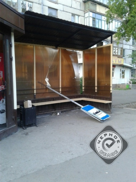 А еще один неизвестный «деятель» сломал знак остановки общественного транспорта и буквально пробил им стену остановочного комплекса.