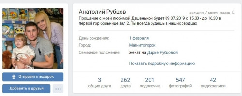 К слову, сегодня – спустя двое суток после кончины Дарьи – на странице Анатолия Рубцова появилась запись, посвященная супруге.