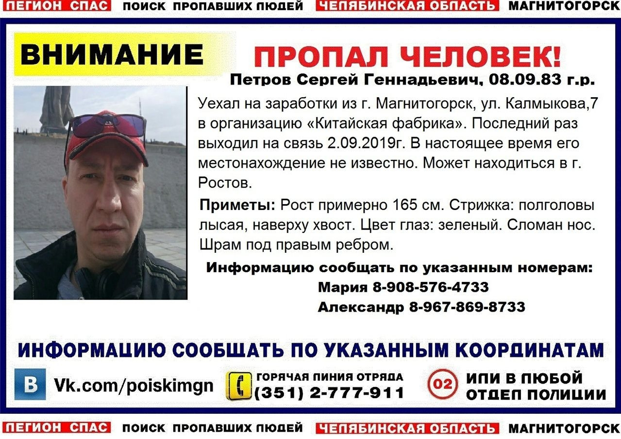 Как рассказали родственники Сергея Петрова, мужчина уехал на заработки в организацию «Китайская фабрика». Последний раз он выходил на связь 2 сентября. С тех пор о нем ничего неизвестно. Он может находиться в Ростове.