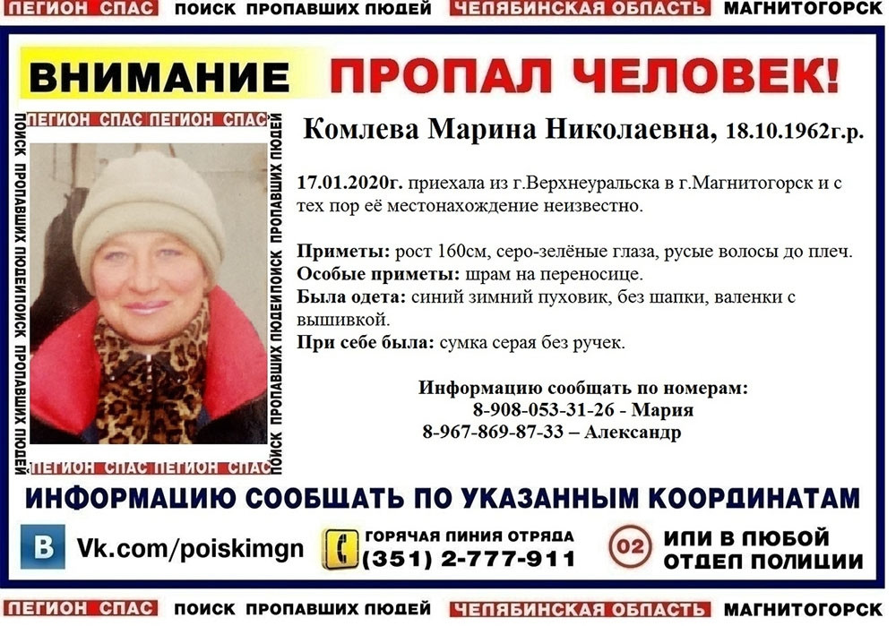 57-летняя Марина Комлева 17 января 2020 года приехала из Верхнеуральска в Магнитогорск. С тех пор о ее местонахождении ничего неизвестно.