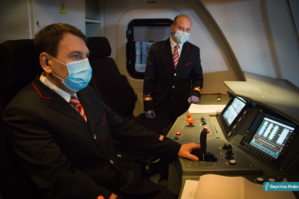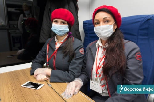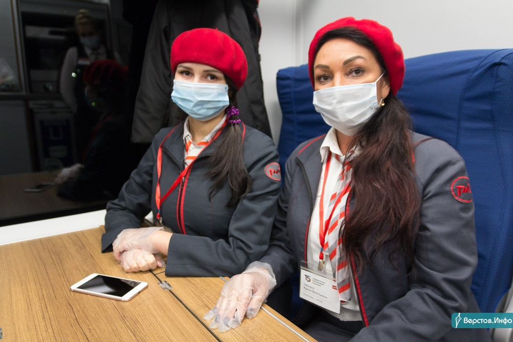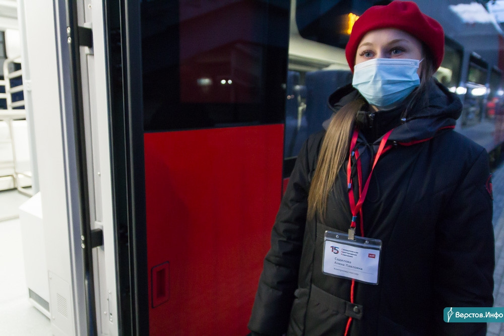 А в 17:55 пятивагонная «Ласточка» отправилась в свой первый четырехчасовой рейс. Впереди было 418 километров пути в Магнитогорск через Троицк, Тамерлан и Карталы. Вместе с пассажирами в путь отправились несколько проводниц, правда, у них на бейджиках было написано, что они контролеры-кассиры. К слову, все они из Свердловской области, но уже сегодня, 6 ноября, в «Ласточке» будут челябинские контролеры-кассиры. Также в поезде находились два охранника, постоянно напоминавшие некоторым пассажирам о том, что в электропоезде необходимо соблюдать масочный режим.