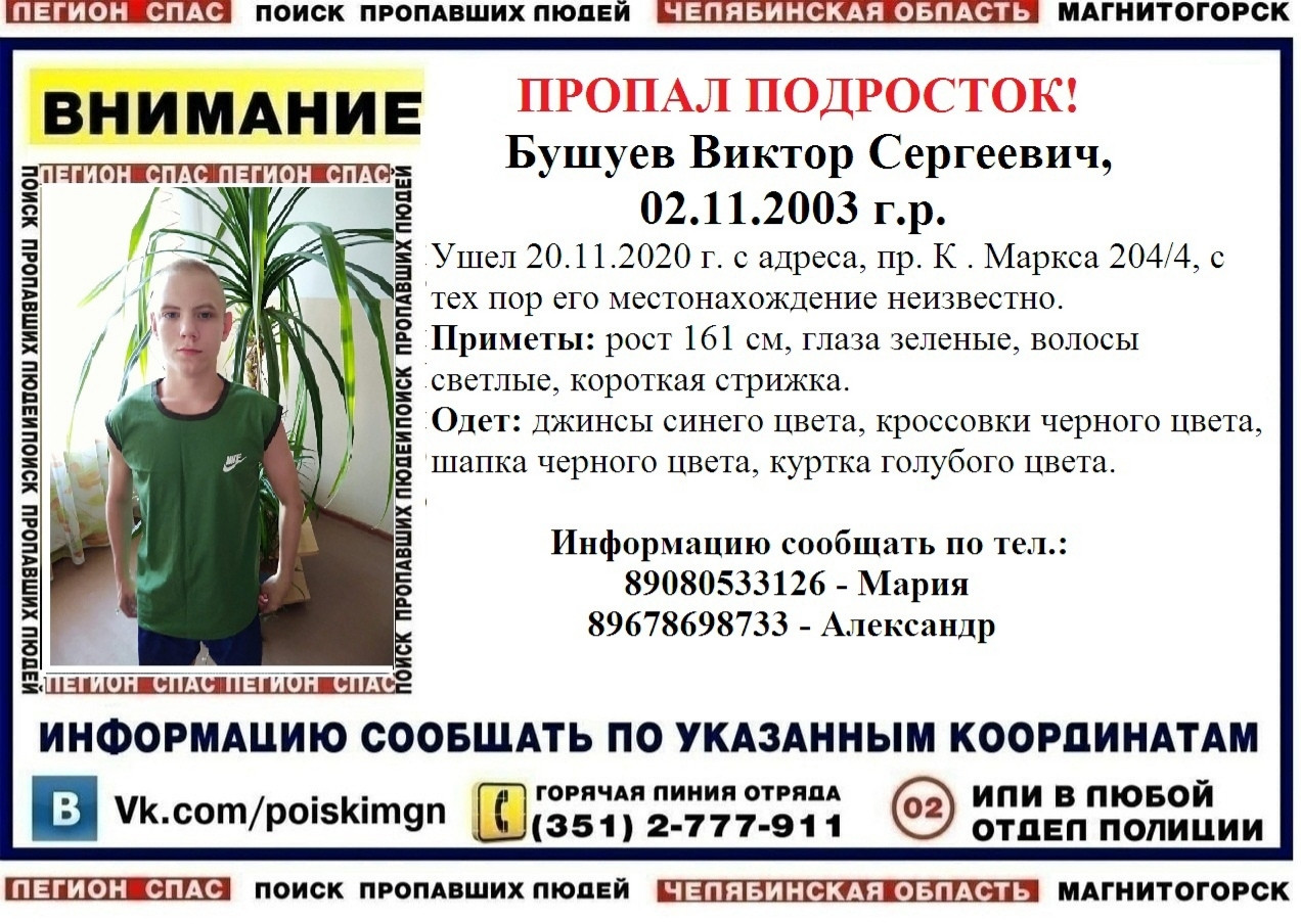 17-летний Виктор Бушуев пропал накануне, 20 ноября. Он ушел из дома по адресу: К. Маркса, 204/4. С тех пор его местонахождение неизвестно.
