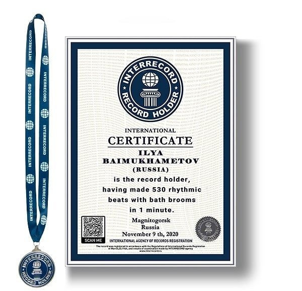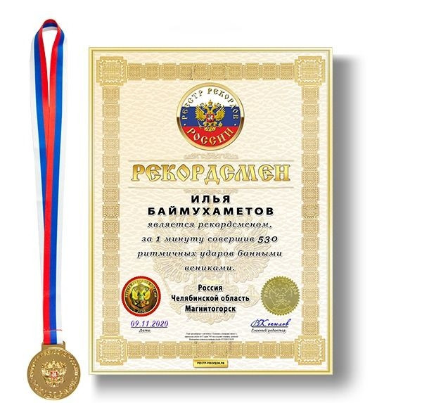 Илья совершил 530 ритмичных ударов банными вениками за минуту, чем поставил рекорд, который официально зарегистрировали в реестре рекордов России.