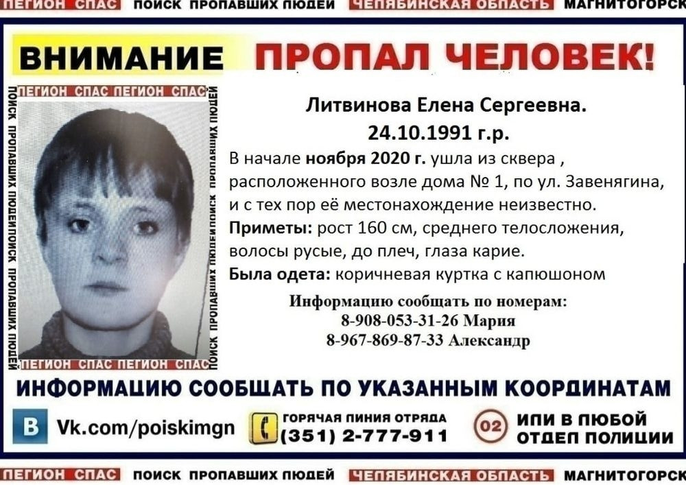 В начале ноября (дата не известна) ушла из сквера, расположенного у дома № 1 на улице Завенягина, 29-летняя Елена Литвинова.