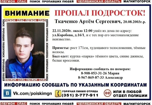 17-летний Артем Ткаченко ушел из дома по адресу: улица Коробова, 16/1 в полдень 22 ноября. С тех пор его разыскивают.