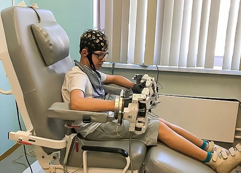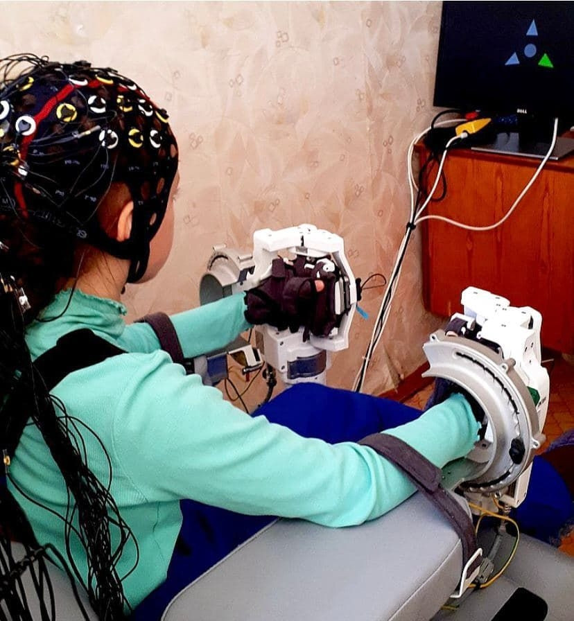 Каждый сеанс длится 60 минут и требует большой сосредоточенности медицинского персонала. К голове маленького пациента подключают электроды электроэнцефалографа для снятия мозговых импульсов, кисти закрепляют в роботизированный экзоскелет. По команде оператора ему необходимо мысленно представить движение рукой – сжатие и раскрытие. Экзоскелет, получая сигнал, выполняет команду. В ходе сеанса проводится последовательная работа, позволяя мозгу применять опыт одной руки для второй.