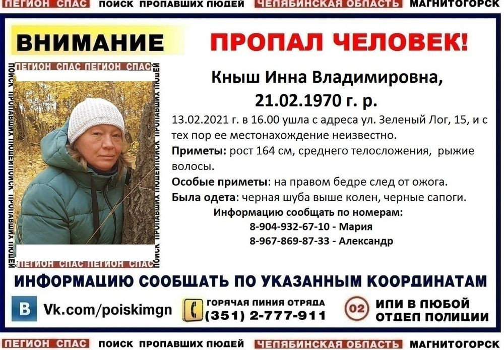 50-летняя Инна Владимировна Кныш ушла из дома № 15 на улице Зеленый лог вчера, 13 февраля, примерно в 16 часов. С того часа женщину никто не видел. Между тем 21 февраля у Инны будет день рождения.