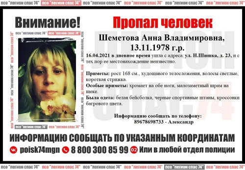 42-летняя Анна Шеметова днем 16 апреля ушла из дома № 23 на улице Николая Шишки. С тех пор о ее местонахождении ничего не известно.