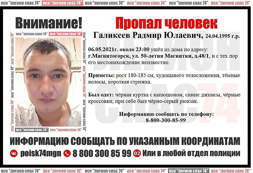 26-летний Радмир Галикеев ушел из дома по адресу: улица 50-летия Магнитки, 48/1 примерно в 11 часов вечера 6 мая. С того дня он не выходил на связь.