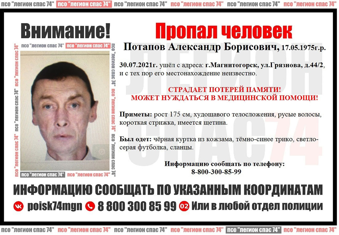 Магнитогорск. Ориентировку на пропавшего опубликовали в поисково-спасательном отряде «Легион Спас74».