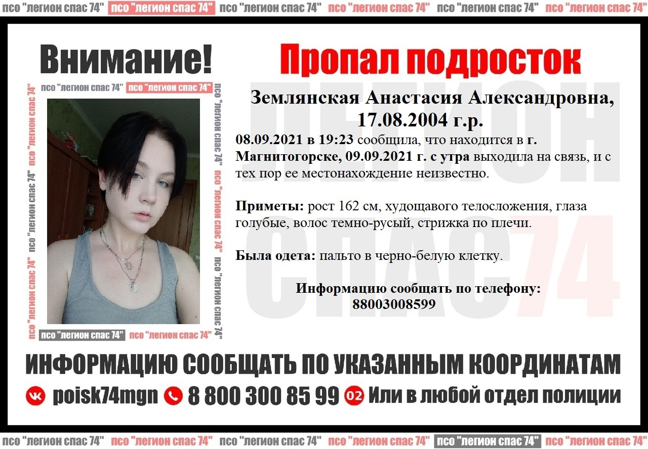 17-летняя Анастасия Землянская 8 сентября в 19:23 сообщила, что находится в Магнитогорске. Последний раз она выходила на связь накануне, 9 сентября, утром. С тех пор ее местонахождение неизвестно.