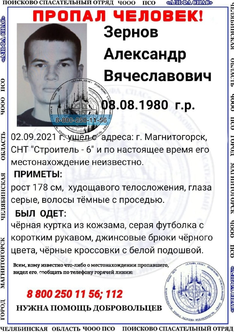 О розыске пропавшего 41-летнего Александра Зернова рассказали в поисково-спасательном отряде «Альфа-Спас». 2 сентября мужчина ушел с территории СНТ «Строитель-6». До сих пор его местонахождение неизвестно.