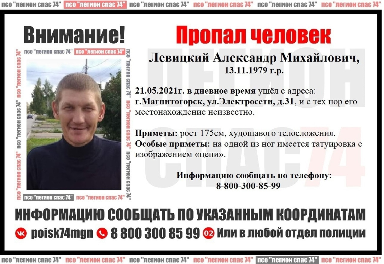 Представители ПСО «Легион-СПАС74» опубликовали две ориентировки. 41-летний Александр Левицкий пропал еще 21 мая. В тот день он ушел с адреса: ул. Электросети, 31. С тех пор его местонахождение неизвестно.