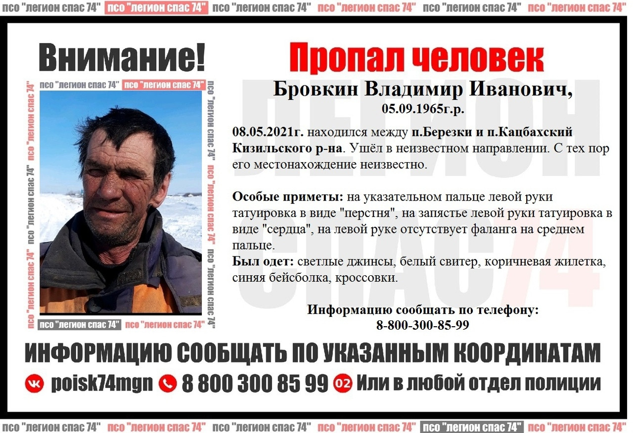 А 56-летний Владимир Бровкин пропал в начале мая этого года. 8 числа он находился между п. Березки и п. Кацбахский Кизильского района, ушел в неизвестном направлении. С тех пор его местонахождение неизвестно.