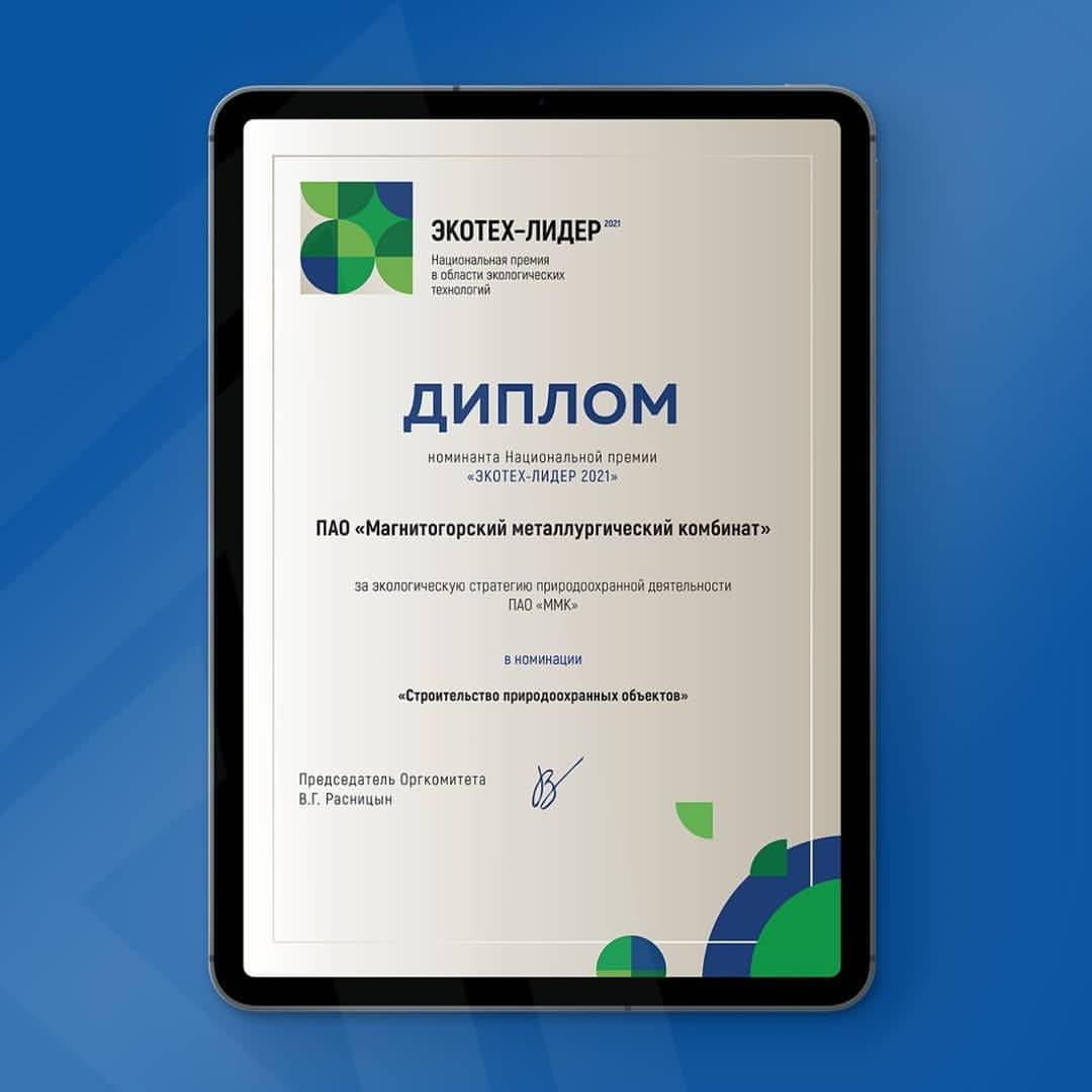 Магнитогорский металлургический комбинат получил диплом номинанта Национальной премии в области экологических технологий «ЭКОТЕХ-ЛИДЕР 2021» в номинации «Строительство природоохранных объектов».