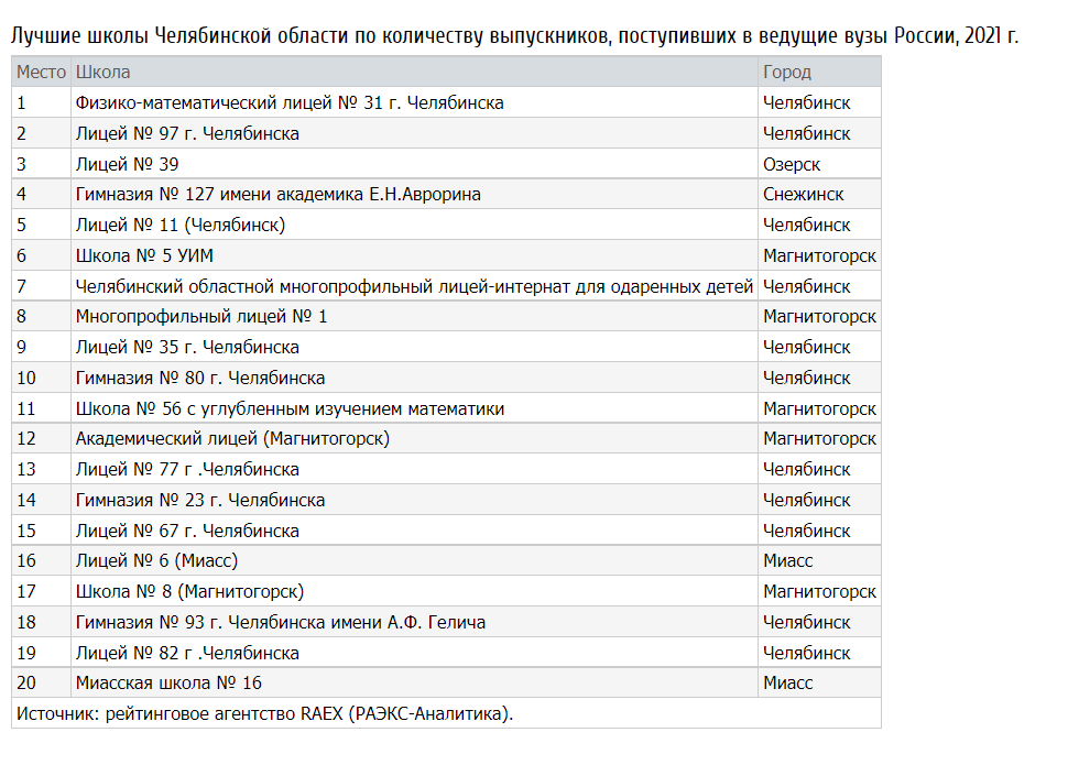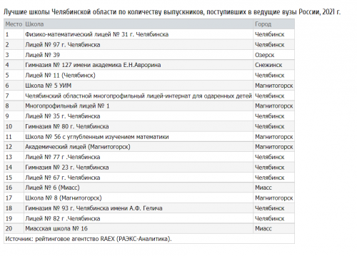 Стоит отметить, что в рейтинг 300 лучших школ России попали всего три представителя Челябинской области. Это физико-математический лицей Челябинска (67-е место), челябинский лицей № 97 (145-е место) и снежинская гимназия № 127 им. академика Аврорина (274-е место).