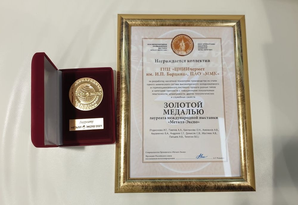 В этом году ПАО «ММК» и ФГУП «ЦНИИчермет им. И. П. Бардина» были награждены золотой медалью выставки с присвоением звания лауреата за совместную «разработку кассетной технологии производства из стали одного химического состава высокопрочного холоднокатаного и горячеоцинкованного листового проката разных типов и категорий прочности с повышенными показателями пластичности, штампуемости, других технологических и служебных свойств».