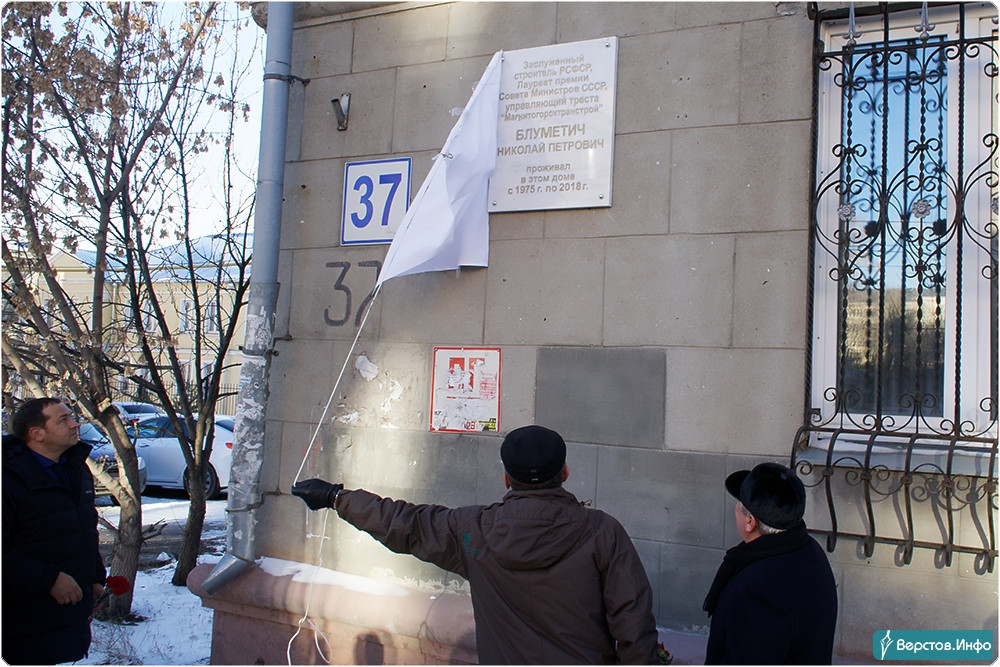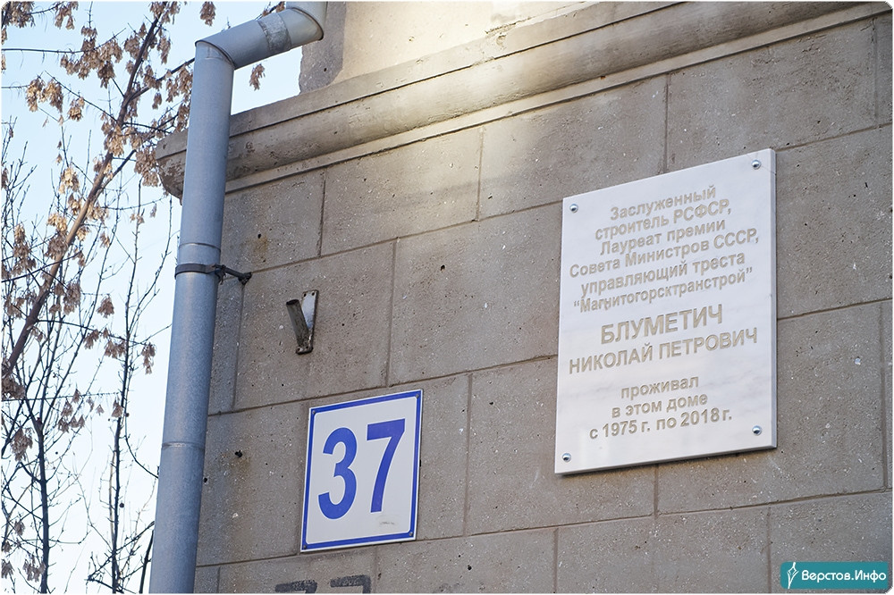 Дом № 37 на улице Комсомольской находится на пересечении с проспектом Карла Маркса. Мемориальную доску памяти Николая Блуметича разместили рядом с восточным торцом этого дома. Именно здесь в одной из квартир более сорока лет, с 1975-го и до самой смерти в марте 2018 года, жил Николай Блуметич. С 1974-го по 1990 год он возглавлял трест «Магнитогорсктрансстрой». Дата открытия мемориальной доски была приурочена ко дню рождения Николая Блуметича. 24 ноября ему могло бы исполниться 93 года.
