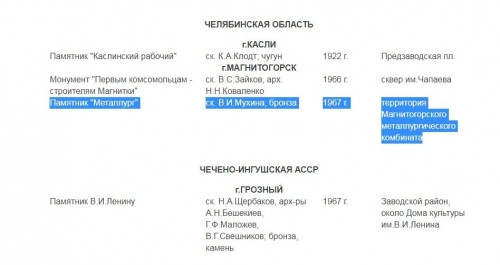 Мы нашли электронную версию того самого постановления Совета Министров РСФСР от 1974 года. Оказалось, что почти 50 лет во всех официальных документах автором памятника «Металлург» значилась именно Вера Мухина, а годом его сооружения (судя по всему, имелась в виду установка на территории ММК) официально был 1967-й. Аналогичная информация перекочевала во все современные списки объектов культурного наследия. Интересно, что в этом документе 1974 года есть еще одна фактическая ошибка. Там указано, что памятник «Металлург» [в 1974 году] все еще стоит на территории ММК, хотя в 1970-м его уже установили на Привокзальной площади Магнитогорска.