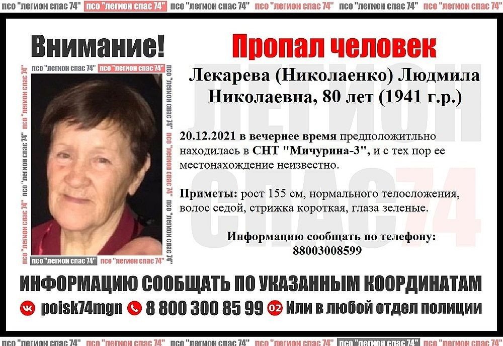 Людмила Николаевна Лекарева последний раз выходила на связь 20 декабря вечером. ПСО «Легион Спас74» опубликовал официальную ориентировку на поиск пропавшей. Родные женщины предполагали, что она в тот день находилась в СНТ им. Мичурина-3 либо вблизи этого сада. Внук и волонтеры немедленно организовали поиски престарелой женщины, было известно, что она сделала телефонный звонок и сообщила, что упала в какой-то овраг и не может самостоятельно выбраться. После этого телефон пенсионерки замолчал.