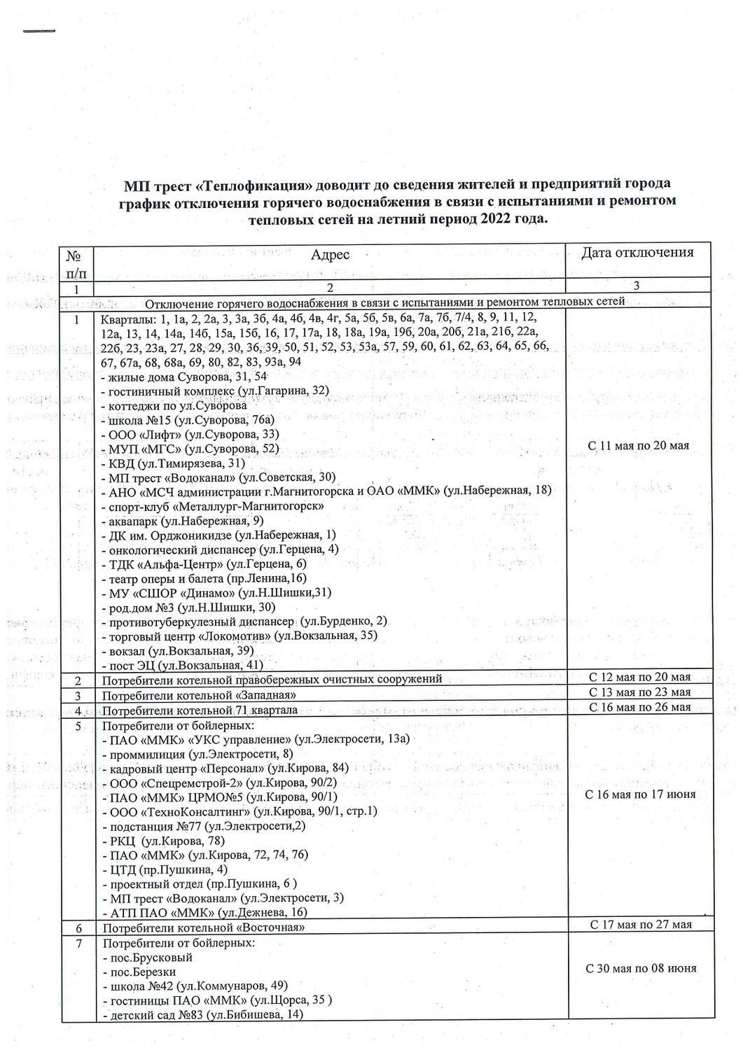 Уже завтра, 11 мая, без горячей воды останутся жители правобережной части Ленинского района (до 20 мая). В правобережной части Орджоникидзевского района горячую воду отключат с 31 мая по 10 июня. Очередь Правобережного района придет с 21 июня по 1 июля, сообщает пресс-служба администрации Магнитогорска.