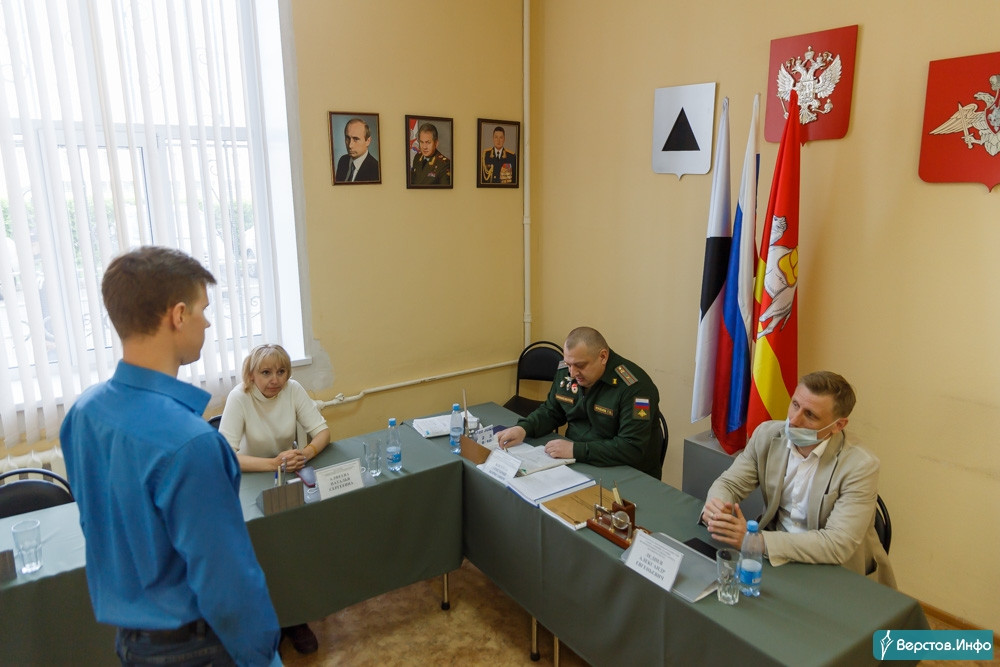 В кабинет заходит юноша, протягивает заместителю председателя призывной комиссии документы, а сам обращается к председателю.