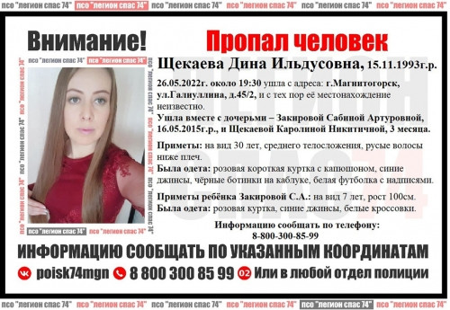 28-летняя Дина Щекаева 26 мая около 19:30 ушла из дома № 45/2 на улице Галиуллина. С тех пор ее местонахождение неизвестно. Женщина ушла вместе с дочерьми – семилетней Сабиной Закировой и трехмесячной Каролиной Щекаевой.