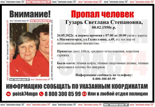 Также волонтеры разыскивают 72-летнюю Светлану Гузарь. Она ушла из дома № 49 на улице Галиуллина 26 мая в период времени с 7:00 до 18:00.
