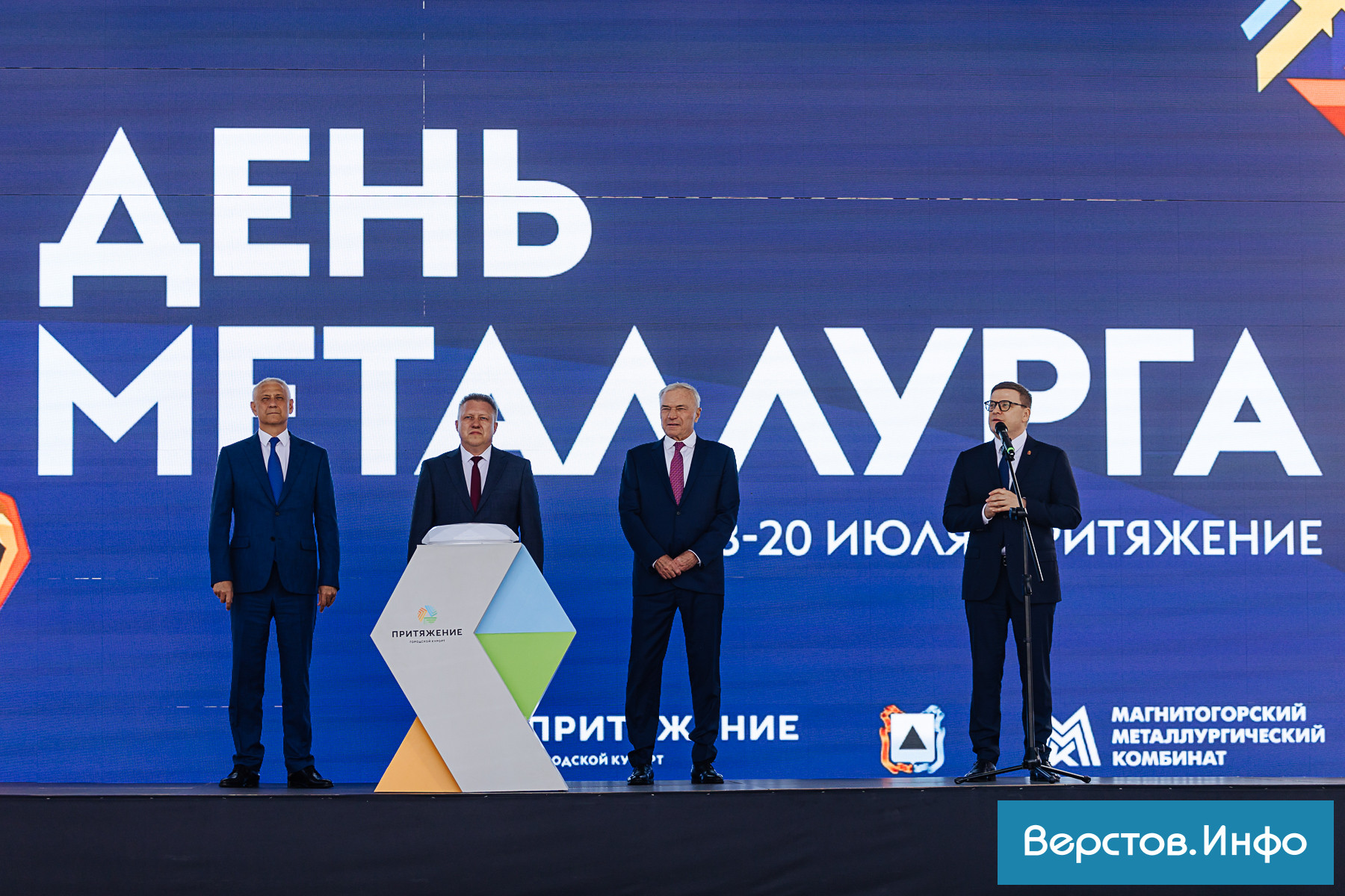 «Дорогие друзья, от души поздравляю вас с Днём металлурга, с Днём города! Традиционно в этот день открываем новую очередь парка «Притяжение». Огромное спасибо Виктору Филипповичу Рашникову, который был инициатором проекта. В этом году открыли детский Центр развлечений. Только что в нём были. Он производит большое впечатление. Уверен, что детям там будет очень интересно. Там не только про развлечение, там и про науку. На днях парк посетил президент России и поблагодарил Виктора Филипповича и магнитогорцев за этот замечательный парк. Мы говорили о развитии Магнитогорска и региона в целом. Большое количество объектов строим. Сейчас посетили новую школу, открыли новые дороги. Много чего хорошего происходит в Магнитогорске благодаря тому, что мы вместе. Регион, город и комбинат. Это здорово».