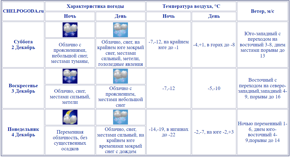 В ночь на понедельник, 4 декабря, существенных осадков не ожидается, зато столбики термометров опустятся до -19 градусов, а местами и до -22 °C. Днём же будет существенно теплее – до -7 °C, на юге и вовсе до +3 °C. Будет идти сильный снег, в южной части Челябинской области – мокрый снег с дождём.
