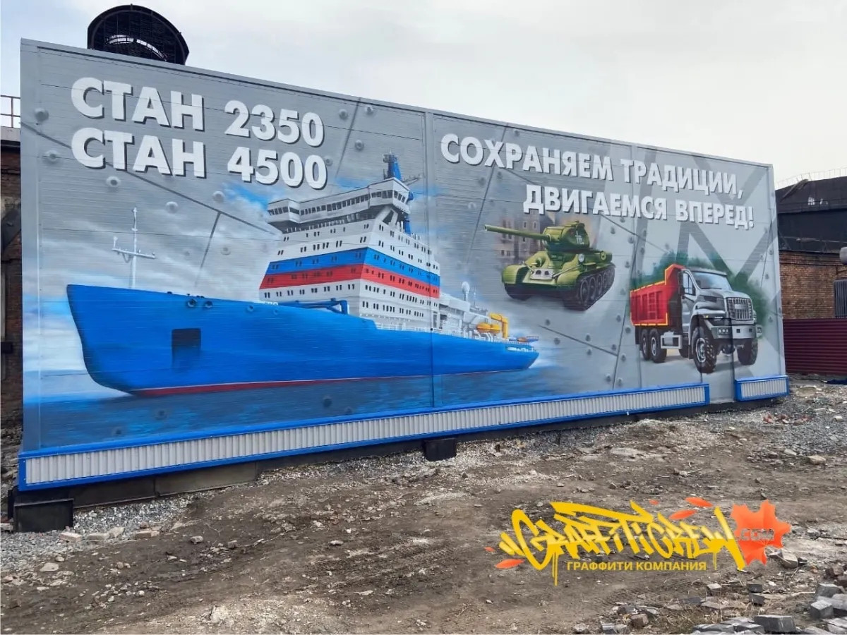 ММК с его стремлением ко всему новому и интересному тенденцию оценил. В июле 2021-го на здании рядом с памятным знаком «Танк Т-10» появился тематический арт-объект, воспевающий трудовой подвиг Магнитки в годы Великой Отечественной войны. Следом – новое граффити, посвящённое легендарным станам «2350» и «4500». Авторами идеи выступили металлурги, реализовать задуманное помогли специалисты управления информации и общественных связей ММК. «Холстом» для картины с производственно-историческим оттенком стало отдельно стоящее здание на территории производства толстого листа. В центре художественного сюжета – танк, грузовик и морское судно. Венчает арт-объект слоган «Сохраняем традиции, двигаемся вперёд», отражающий политику Магнитогорского металлургического комбината. Оба легендарных стана до сих пор в строю, выпускают листовой прокат, предназначенный для самых различных отраслей промышленности. Металлурги-прокатчики отмечают: мурал не просто яркое свидетельство производственных достижений, но и источник вдохновения, повод для гордости.