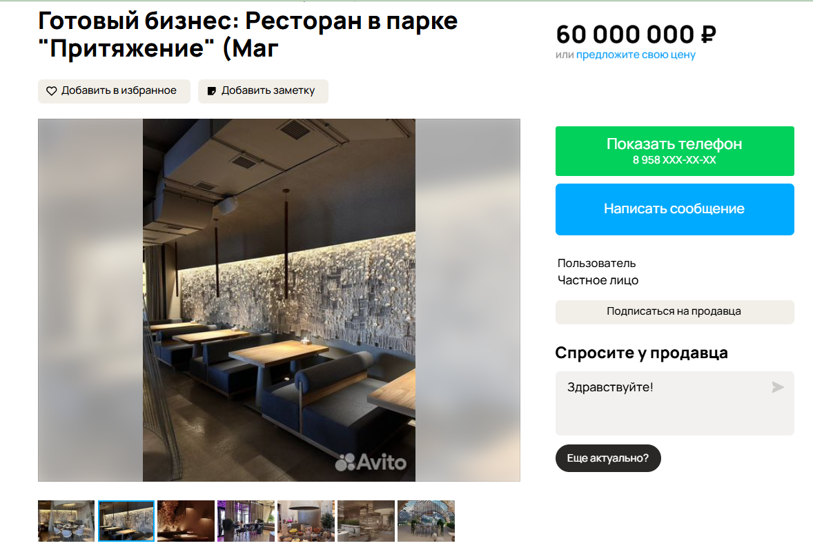 В объявлении говорится о премиальном расположении ресторана, а также о том, что к 2027 году его выручка может достичь 7 млн рублей в месяц. Также заведение оборудовано всем необходимым – от новой техники до мебели и дизайнерского интерьера. За два года работы укомплектован штат, есть готовая клиентская база.