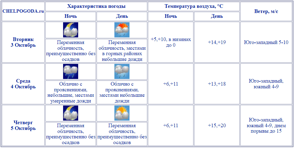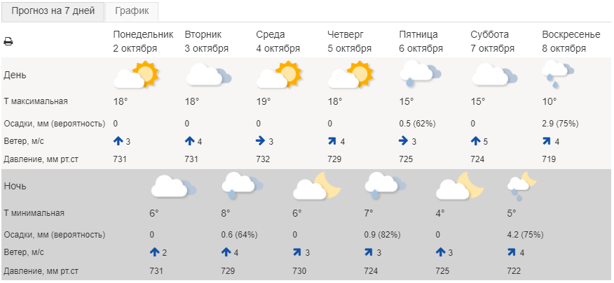 В среду, 4 октября, также возможны дожди. В ночные часы будет до +11 градусов, днем – до +18 °С. В четверг, 5 октября, ночью ожидается около +10 градусов, а вот днем местами воздух прогреется аж до +20 °С!