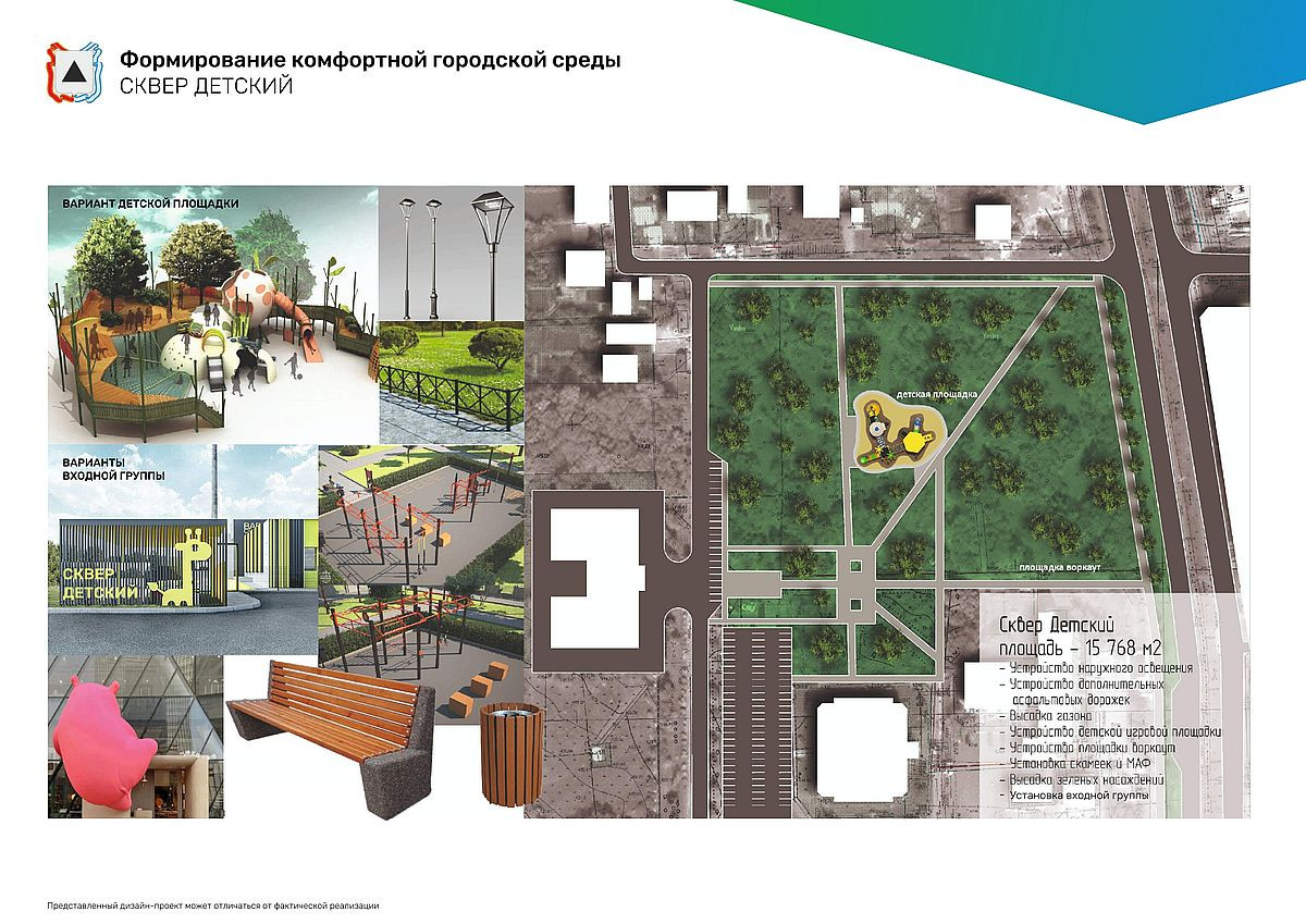 Сквер Детский не первый раз «доходит» до сбора предложений по его переустройству. Архитекторы предлагают при его благоустройстве взять за основу здоровый образ жизни, а яркими красочными цветами и ростовыми МАФ-фигурами подчеркнуть, что он действительно создан для детей. В сквере сделают несколько зон: для спорта, прогулок, отдыха. Естественно, что внутри существующая инфраструктура подвергнется глубокой переработке: сделают освещение (его там не было никогда), асфальтовые дорожки, установят скамейки, разобьют газоны, высадят кустарник и деревья.