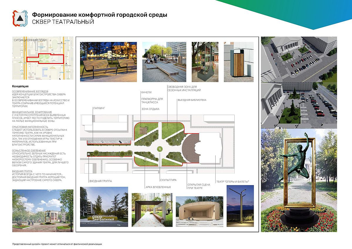 В Театральном сквере предлагают эффектно обыграть тему театра: зоны отдыха наполнят удобными скамейками, установят фонари-торшеры, оборудуют сцену-эстраду. Возможно, что в будущем на ней будут выступать подающие надежды начинающие актёры. В скверике можно будет посидеть перед премьерой либо, наоборот, прийти в себя после захватывающего водевиля, который давали на сцене театра оперы и балета.