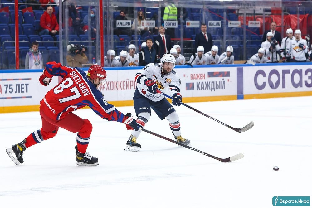 Сорок минут отчетной игры команды провели совершенно на равных: Светлаков отправил шайбу в «домик» Олкинуоры, Чибисов сравнял с передачи Лайпсика. ЦСКА вновь вышел вперед, но Лайпсик великолепно ответил – 2:2!