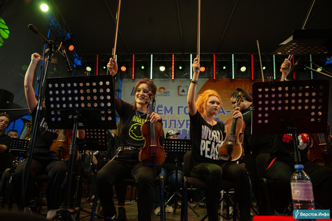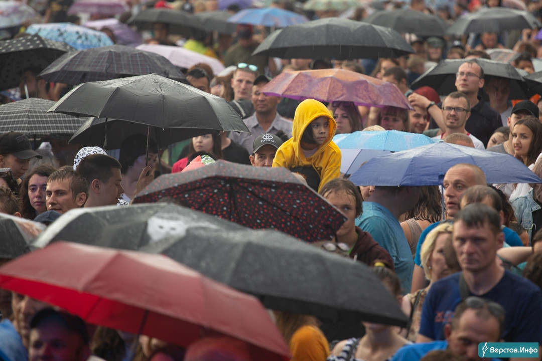 Что касается уличной части празднования, то здесь зрителям немного не повезло с погодой – прошел пусть и короткий, но интенсивный дождь. Правда, задора горожан он не убавил. Магнитогорцев порадовали своим выступлением группы «Пропаганда» и CarMan. Харизматичный солист CarMan Сергей Лемох спустя годы все же выступил на главном городском празднике и исполнил все самые известные хиты своей группы. Концертную часть на сцене за Ареной «Металлург» завершал проект Магнитогорского концертного объединения «Оркестр in Rock».