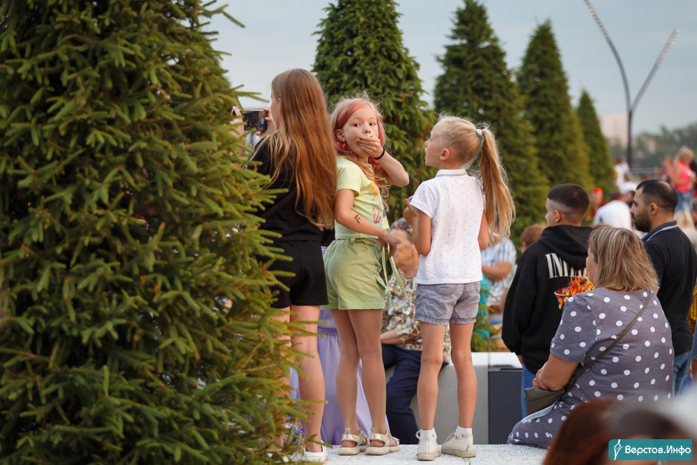 Праздничная программа стартовала на территории «Притяжения» еще днем. Погода способствовала тому, что довольно много горожан пришли в парк задолго до начала концертной программы. Ребятня с энтузиазмом тестировала новую детскую площадку, детей и взрослых развлекали аниматоры. Юные магнитогорцы и их родители были в восторге и от масштабной пенной дискотеки.