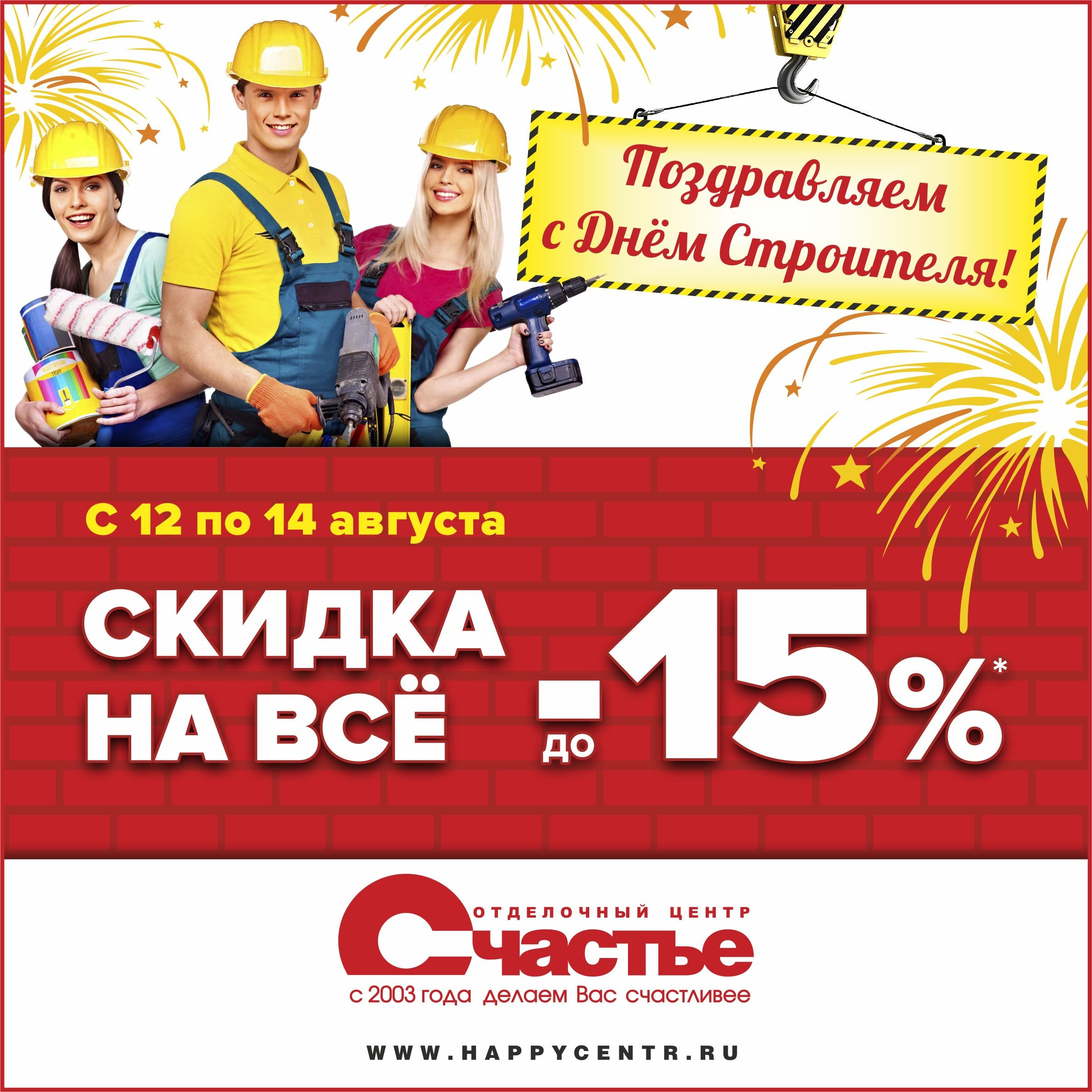 Только с 12 по 14 августа в честь Дня строителя Отделочный Центр «Счастье» дарит всем скидку на всё до -15 %! Не упустите возможность выгодно и комфортно обустроить свою квартиру или дом!