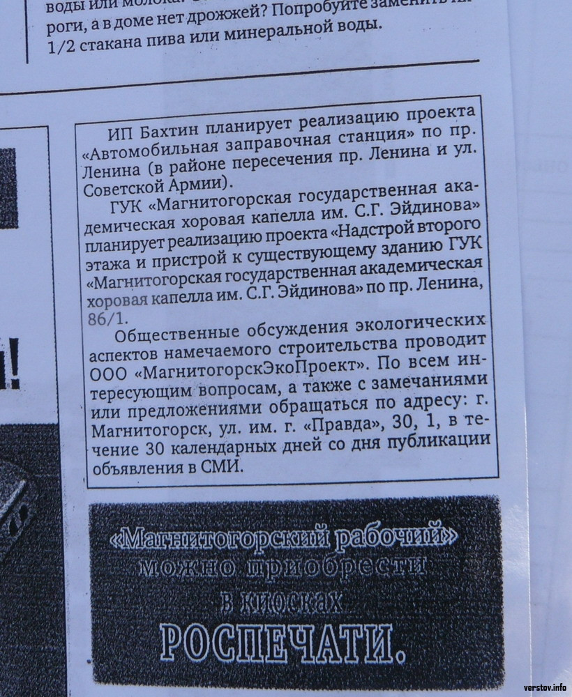 Тем временем жильцы не знают, куда обращаться, чтобы защитить свои интересы: перспектива жить бок о бок с заправкой, наблюдать из окна идущие бензовозы их не устраивает. По «горячим следам» позвонив в Госпожнадзор, они услышали только одно: «Мы этим вопросом не занимаемся». Пройдя на место бывшего теперь уже парка, им удалось сфотографировать копию протокола так называемых общественных обсуждений проекта АЗС, подписанного начальником управления окружающей среды города А.Н. Пирожковым. На обсуждении присутствовали кроме самого заказчика, господина Бахтина, представитель ГИП ООО «Главпроект» и директор ООО «МагнитогорскЭкоПроект». Вероятно, в таком узком круге жарких дискуссий не возникло. Участники оценили проект положительно и рекомендовали предусмотреть мероприятия по снижению негативного воздействия на окружающую среду. Как выглядят на деле эти мероприятия, бригады рабочих, которые сейчас уничтожают саженцы, не знают.