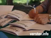 12:20. Во время прогулки, на глазах у отдыхающих, за столиком в уютном летнем кафе Александра Николаевна и Николай Николаевич оставили свои подписи на сборниках песен.