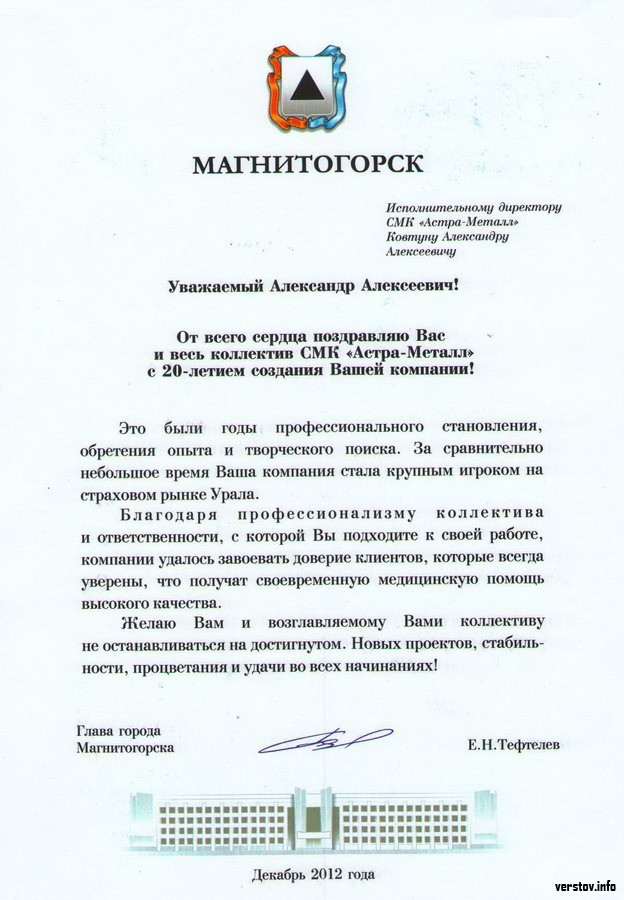Магнитогорск. Дважды они признавались лучшими в Уральском федеральном округе. В 2012 году им не нашлось равных в Магнитогорске. Сейчас входят в двадцатку самых лучших страховых компаний в России... В середине декабря компания «Астра-Металл» отпраздновала 20-летний юбилей. Накануне знаменательной даты в адрес руководства стали приходить поздравления от высокопоставленных лиц и преданных клиентов компании.