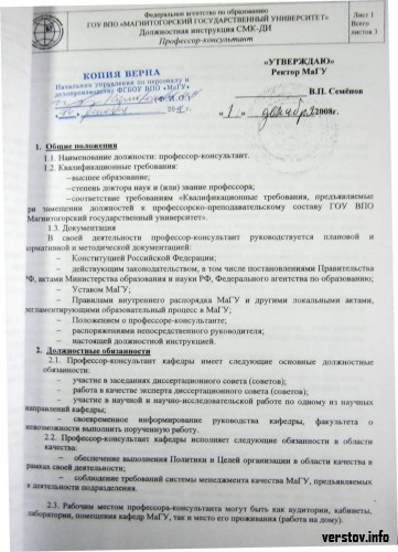 Согласно п.2.1 должностной инструкции, представленной В.П. Семеновым в СУ СК по Челябинской области, «профессор-консультант» имеет следующие должностные обязанности (за что, собственно, и получает зарплату): участие в заседании диссертационного совета (советов); работа в качестве эксперта диссертационных совета (советов); участие в научной и научно-исследовательской работе по одному из научных направлений кафедры. Иной работы, в том числе учебной (лекции, семинары и т.п.) и учебно-методической для профессора-консультанта не предусмотрено.