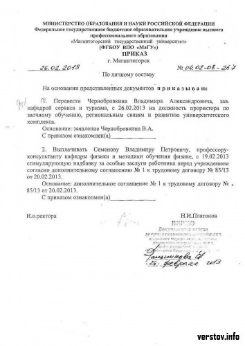 Вместе с тем, при наличии подобных «тепличных» условий труда, размер зарплаты профессора-консультанта (около 19 тысяч рублей), видимо, оказался неприемлемым для бывшего ректора, который привык к иному порядку исчисления своих доходов, получаемых из средств вуза. Поэтому приказом от 26.02.2013г. №04.02-08-267 и.о. ректора назначил Семенову В.П. с 19.02.2013 г. стимулирующую надбавку (сумма не указана) с формулировкой «за особые заслуги работника перед учреждением согласно дополнительному соглашению №1 к трудовому договору №85/13 от 20.02.2013» (см.: скан).