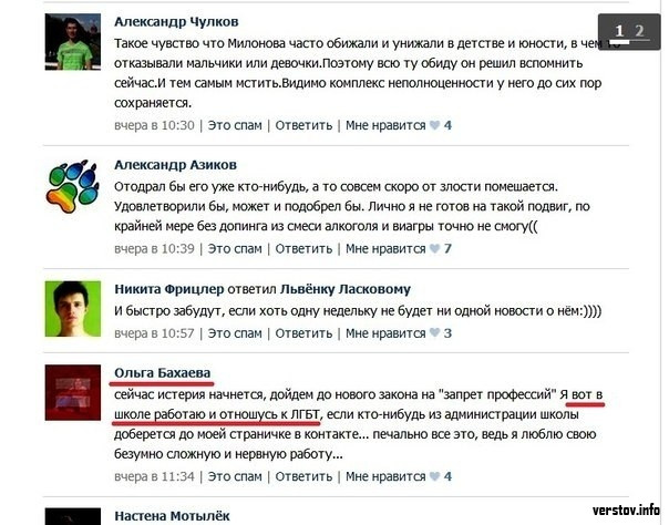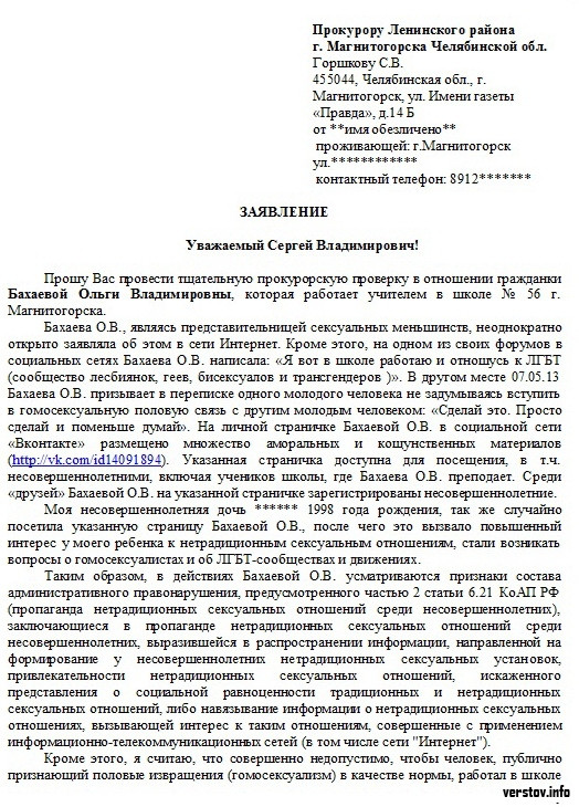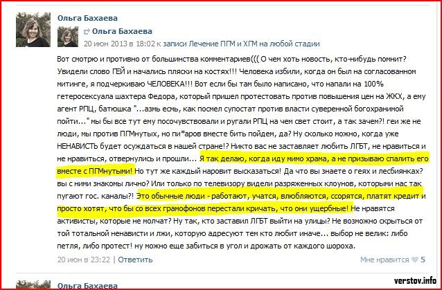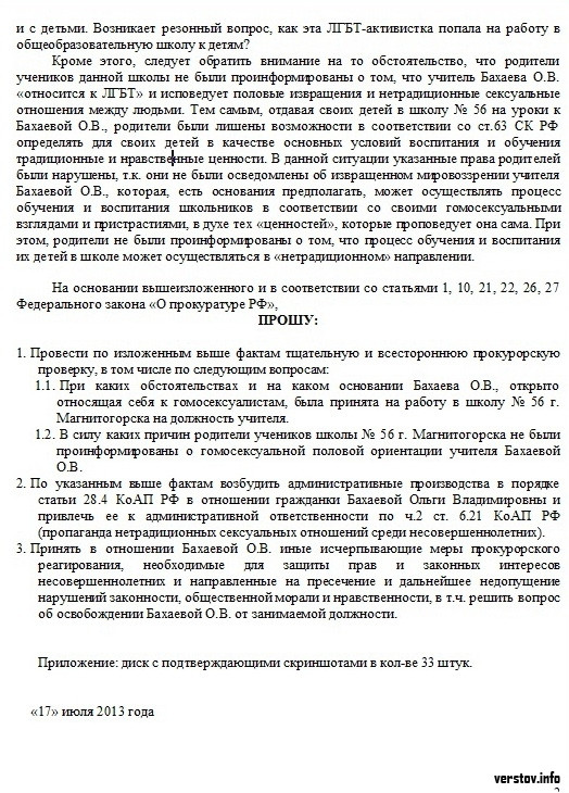 «Родители Урала заявляют, что учителя, которые выступают против гомофобного закона, нарушают ФЗ «О запрете пропаганды гомосексуализма среди несовершеннолетних» и должны нести за это ответственность. Ты можешь иметь любую ориентацию, но ты не афишируй это! Личная страница в соцсети - это не личный дневник, а у неё в друзьях несовершеннолетние, возможно, её ученики! (отметим, в друзьях у Ольги Бахаевой действительно есть подростки). Говорят, что врожденные нарушения половой ориентации - это одна десятитысячная всех отклонений, остальное - от таких активистов и учителей. Ольга Бахаева в школах Магнитогорска работать не будет и обязательно понесет ответственность за свои действия по закону! Не зря он появился, и в его принятии родительский комитет полностью поддерживает правительство».