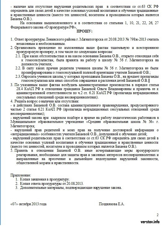 И то, что педагог уже уволилась из школы, комитетчики считают недостаточным для неё наказанием. Поэтому в связи с бездействием органов надзора, магнитогорским родительским комитетом отправлена жалоба прокурору Челябинской области государственному советнику юстиции 2 класса Александру Войтовичу о привлечении Ольги Бахаевой к административной ответственности за пропаганду гомосексуализма среди несовершеннолетних. Если же и там им не удастся добиться наказания для педагога, родительский комитет планирует идти дальше, писать обращения в Следственный комитет и Генеральную прокуратуру…
