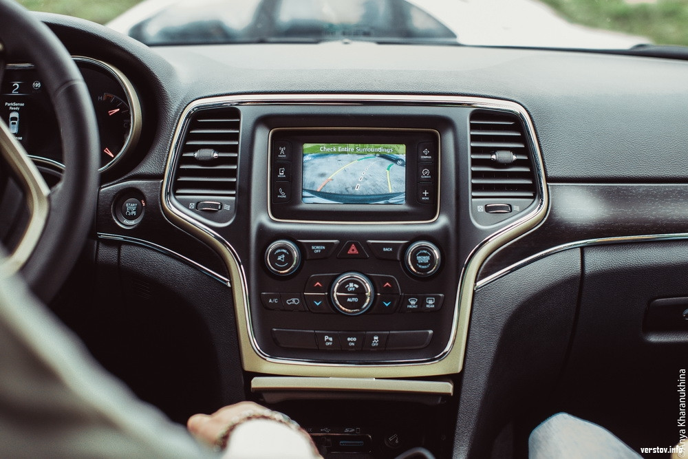 Как и положено премиальному внедорожнику, Grand Cherokee дарит удовольствие от вождения с первых секунд. Благодаря гидроусилителю с электронасосом, руль кажется почти невесомым. Кстати, он абсолютно новый, как и приборная панель с 7-дюймовым ЖК-дисплеем, который показывает массу полезной информации, начиная от скорости движения и заканчивая схемой блокировки дифференциалов. Отображаемую информацию можно комбинировать как душе угодно — вариантов порядка 60.