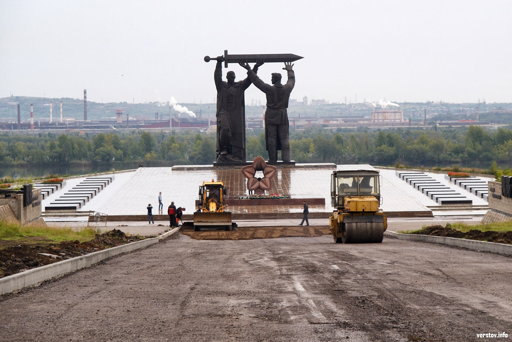 Магнитогорск. Пирамидальные тополя и «Вздыбленная земля». Ремонтные работы по благоустройству территории, прилегающей к монументу «Тыл-Фронту», идут полным ходом: успеть надо к юбилею Победы. Сейчас на аллее, ведущей к монументу, снят асфальт, уложены новые бордюры. Вскоре здесь появится «Река времени».