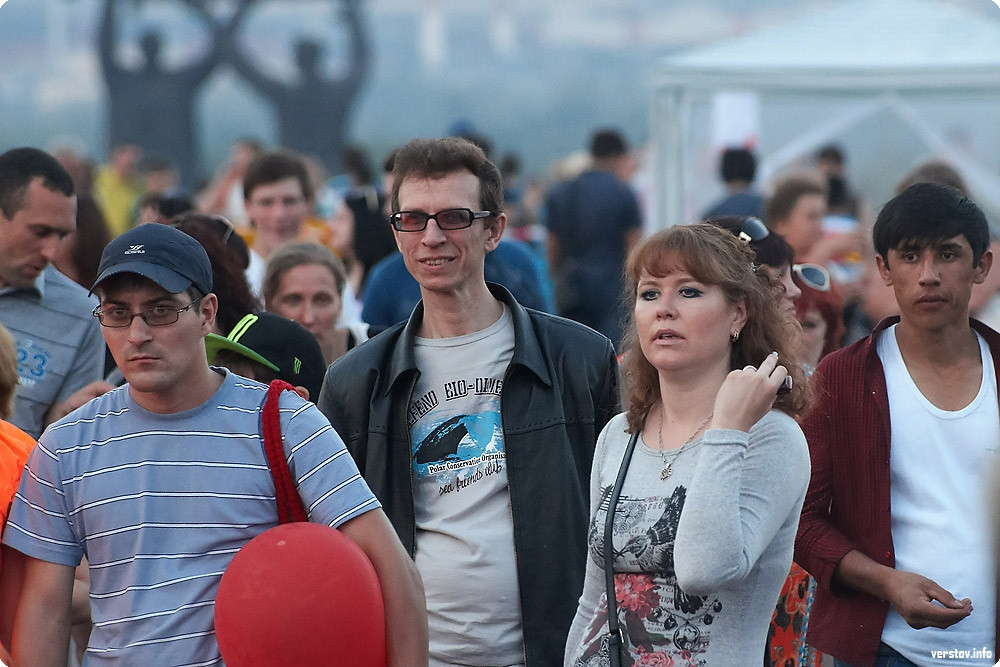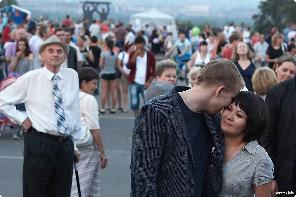 Получасом позже на праздничную сцену поднялся коллектив «Баян-позитив», и теперь устоять от соблазна сплясать под «Ламбаду» в исполнении всенародно любимого инструмента – баяна – не мог почти никто. Подвыпившие, счастливые и взмокшие от невероятной жары магнитогорцы не стеснялись и радостно скакали под всем знакомые мелодии. Не было равнодушных и среди детей: одни собирались в кружки и танцевали, подражая взрослым, другие бегали с воздушными шарами и пускали мыльные пузыри, третьи сидели на папиных шеях и пытались рассмотреть выступавших артистов.