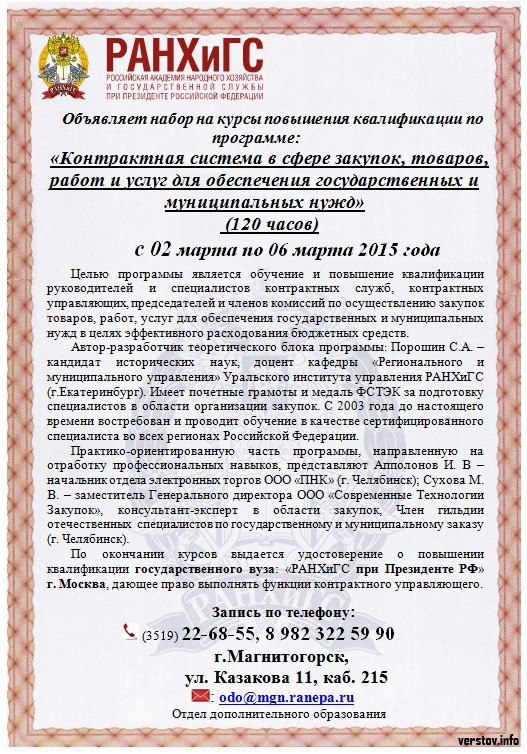 В настоящее время Отдел дополнительного образования ведет набор на курсы повышения квалификации по программе «Контрактная система в сфере закупок, товаров, работ и услуг для обеспечения государственных и муниципальных нужд» (44-ФЗ и 223-ФЗ), по окончании которых выдается удостоверение о повышении квалификации Академии при Президенте РФ.